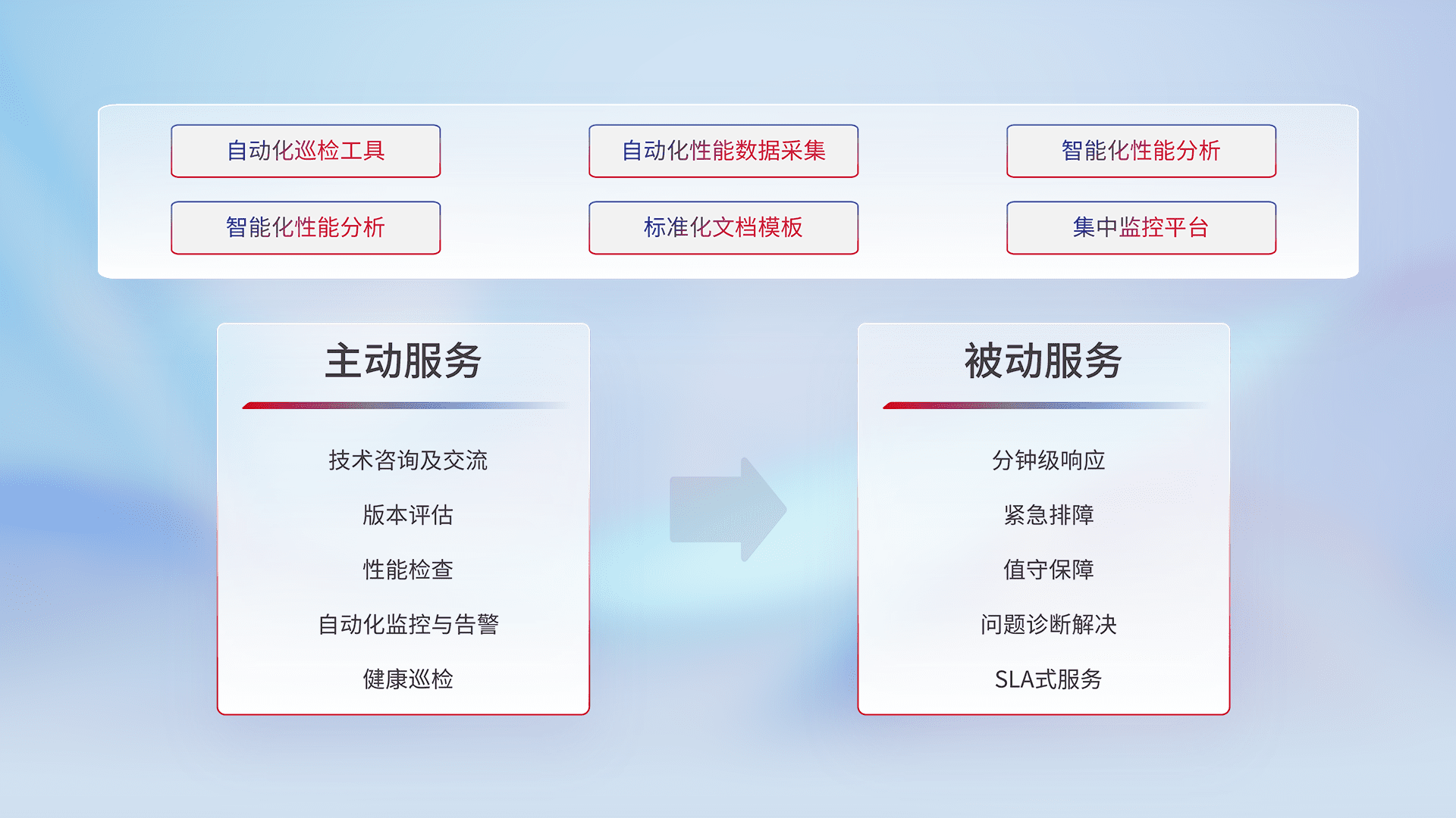智能化工具和标准化文档,,,,保障服务质量,,,,提供主动服务(包含技术咨询、、版本评估、、、性能检查、、、自动化监控与告警、、健康巡检)和被动服务包含(分钟级响应、、、紧急排障、、值守保障、、、、问题诊断解决、、、、SLA服务)。。。